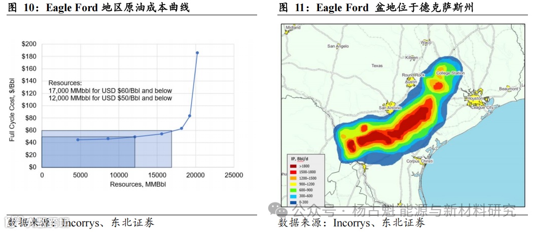 Eagle Ford区域,约28%储量的原油成本在60美金/桶之上。据Incorrys数据,在Eagle Ford区域,有约12000百万桶原油资源的全周期成本在50美金/桶之下,有约17000百万桶原油资源的成本低于60美元/桶。