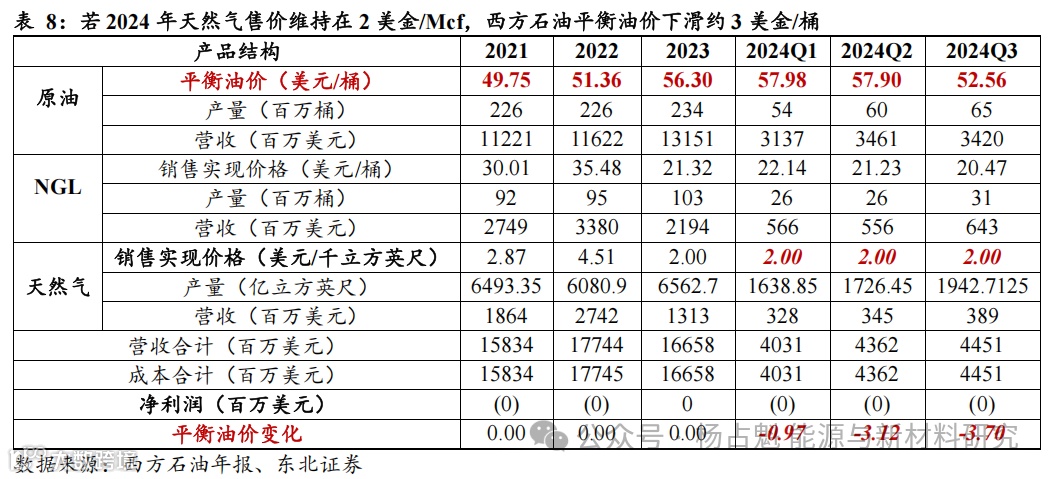 我们根据西方石油报表披露的NGL及天然气的产量、均价,以及原油的产量,计算出:2024年,西方石油保平油气板块净利润所需的最低油价已接近60美金/桶。这主要是由于天然气价格的持续走低,以及西方石油油气比的下滑,这意味着西方石油需要更高的油价去补贴天然气市场的萎靡,若2024年油价跌破60美金/桶,西方石油的油气板块或面临亏损。
