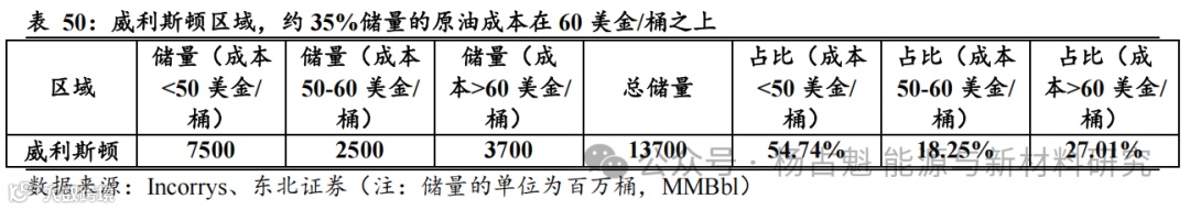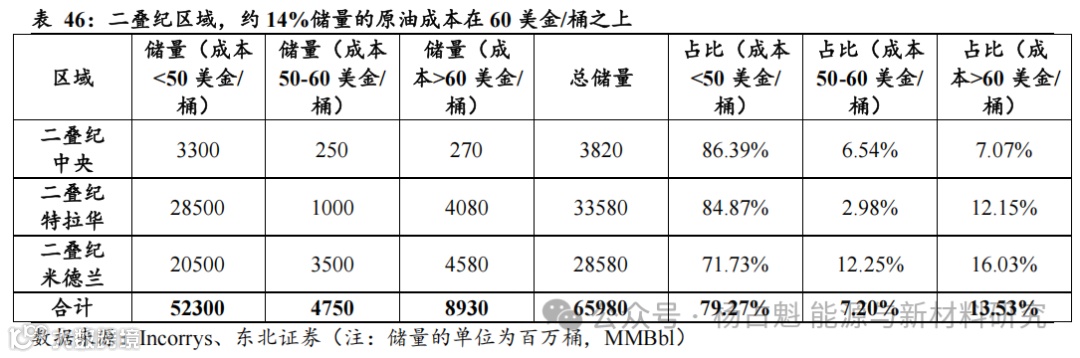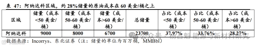 据此我们推算:在阿纳达科区域,约38%储量的原油成本低于50美金/桶,约34%储量的原油成本在50-60美金/桶,约28%储量的原油成本高于60美金/桶。