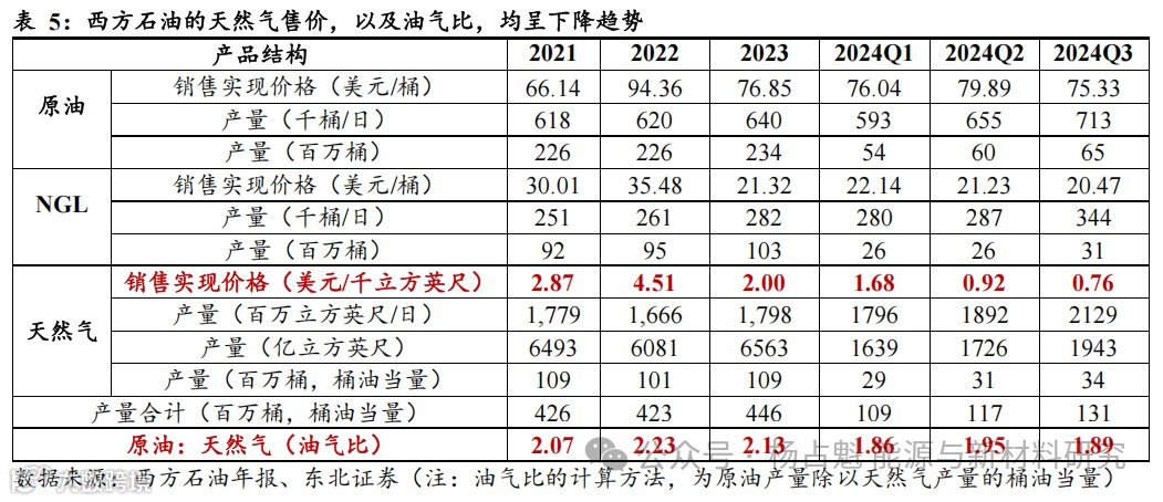 西方石油的天然气售价,以及油气比,均呈下降趋势。