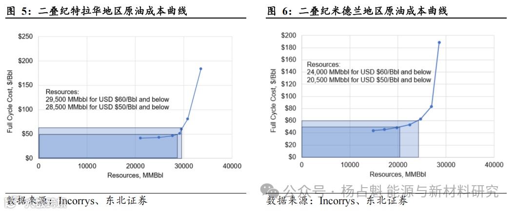 二叠纪区域,约14%储量的原油成本在60美金/桶之上。据Incorrys数据,在二叠纪中央区域,有约3300百万桶原油资源的全周期成本在50美金/桶之下,有约3,550百万桶原油资源的成本低于60美元/桶;在二叠纪特拉华区域,有约28500百万桶原油资源的全周期成本在50美金/桶之下,有约29500百万桶原油资源的成本低于60美元/桶;在二叠纪米德兰区域,有约20500百万桶原油资源的成本在50美金/桶之下,有约24000百万桶原油资源的成本低于60美元/桶。