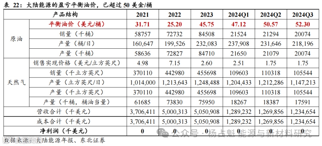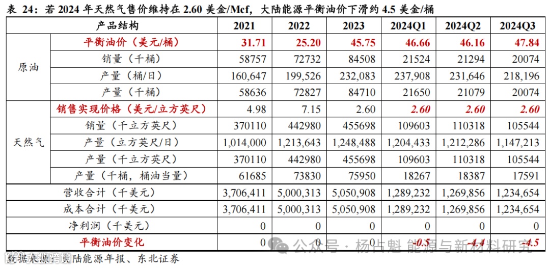 2024年,大陆能源的桶油成本接近32美金/桶,考虑大陆能源天然气售价的持续下滑,2024年大陆能源保平其净利润所需的平衡油价已超过50美金/桶。