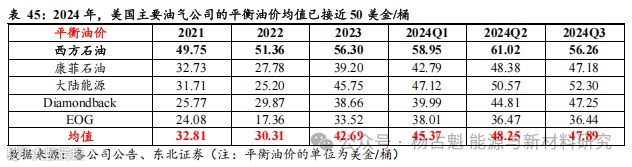 我们发现:2024年美国主要油气公司的平衡油价均值已接近50美金/桶(详细计算流程及分析见本报告的公司部分)。