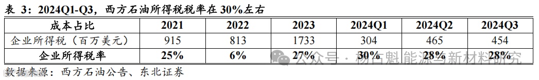 受海外业务影响,西方石油所得税率在30%左右,高于美国法定税率21%。