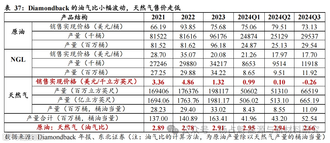 我们根据Diamondback披露的财务报表,对Diamondback的产品结构做了以下拆分(详情见表37),我们发现: