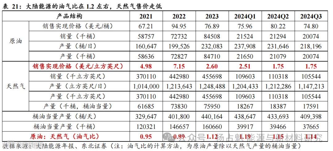 根据大陆能源报表披露的数据,我们发现大陆能源天然气的销售实现均价,从2023年的2.60美金/Mcf,跌至2024Q1、Q2、Q3的2.51美金/Mcf、1.75美金/Mcf、1.75美金/Mcf。
