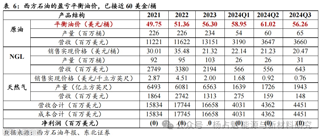 2024年,西方石油的桶油成本接近40美金/桶,考虑西方石油天然气售价的持续下滑,以及油气比的下降,2024年西方石油保平其净利润所需的平衡油价已接近60美金/桶。