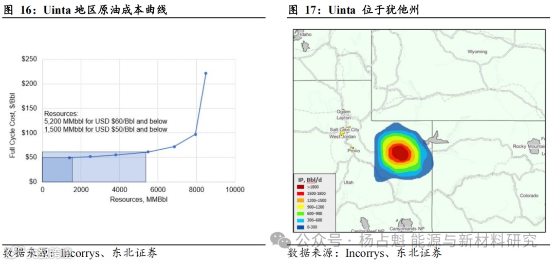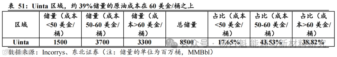 据此我们推算:在Uinta区域,约18%储量的原油成本低于50美金/桶,约44%储量的原油成本在50-60美金/桶,约39%储量的原油成本高于60美金/桶。