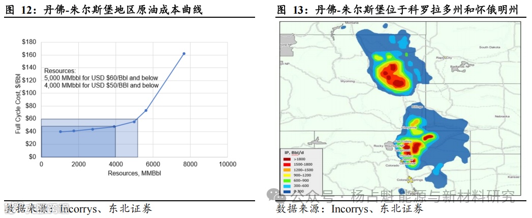丹佛-朱尔斯堡区域,约28%储量的原油成本在60美金/桶之上。据Incorrys数据,在丹佛-朱尔斯堡区域,有约4000百万桶原油资源的全周期成本在50美金/桶之下,有约5000百万桶原油资源的成本低于60美元/桶。