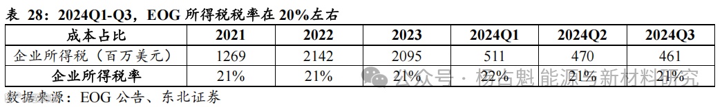 EOG主要在北美地区开展业务,所得税率在21%左右,基本等于美国法定税率。