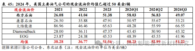 我们发现:2024年美国主要油气公司的现金流油价均值已超过50美金/桶(详细计算流程及分析见本报告的公司部分)。