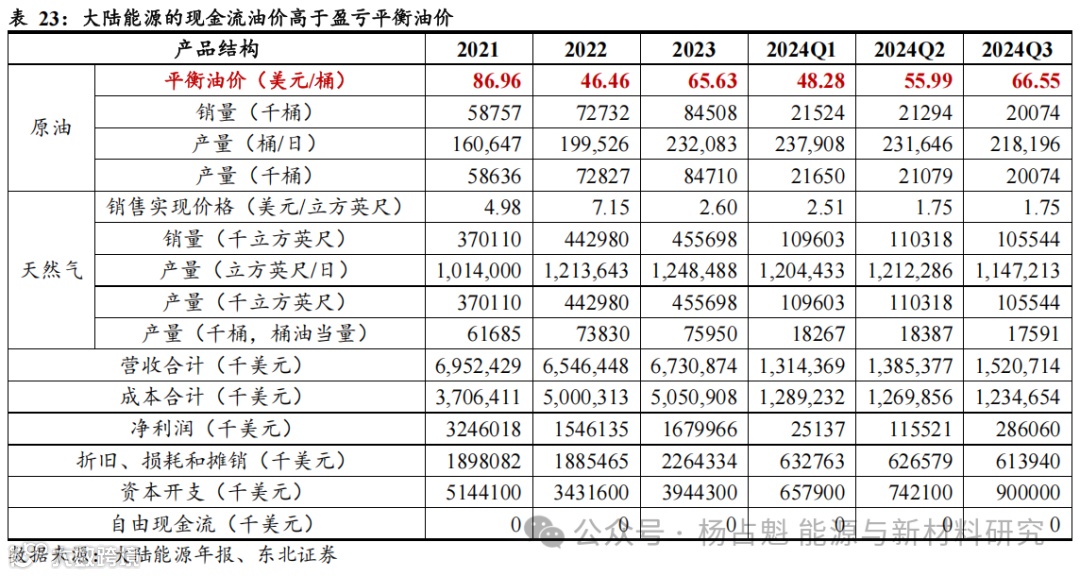 我们认为,受资本开支较大的影响,大陆能源2024年平衡油价、现金流油价处于较高水平,预计后续资本开支或偏谨慎。