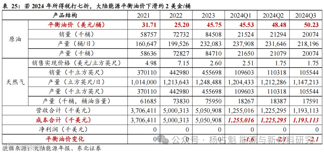 我们假设2024年大陆能源整体的所得税均打七折,按照所得税调整后的成本计算,我们发现:若2024年所得税打七折,大陆能源平衡油价下调约2美金/桶,变化不大。