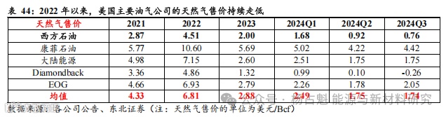 3、天然气售价: 自2022年以来,美国主要油气公司天然气的销售实现价格显著走低,2024Q3,部分企业甚至存在“负气价”。