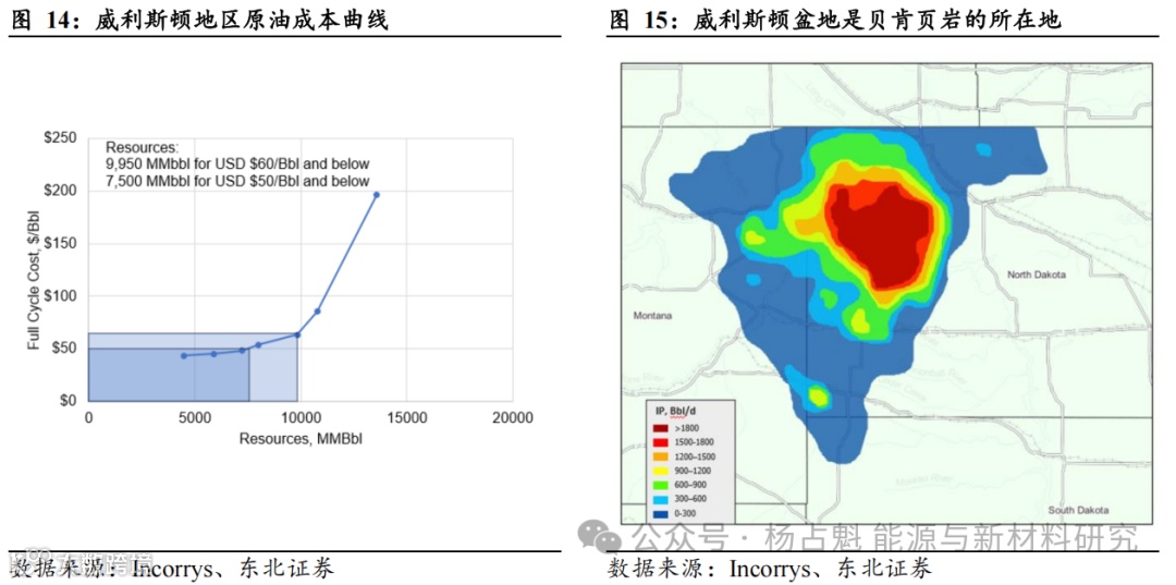 威利斯顿(Williston)区域,约27%储量的原油成本在60美金/桶之上。据Incorrys数据,在威利斯顿堡区域,有约7500百万桶原油资源的全周期成本在50美金/桶之下,有约10000百万桶原油资源的成本低于60美元/桶。