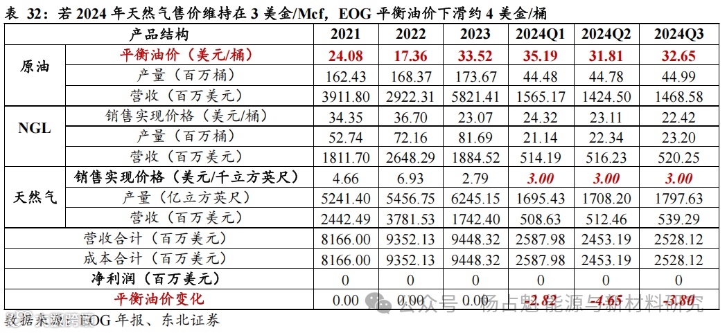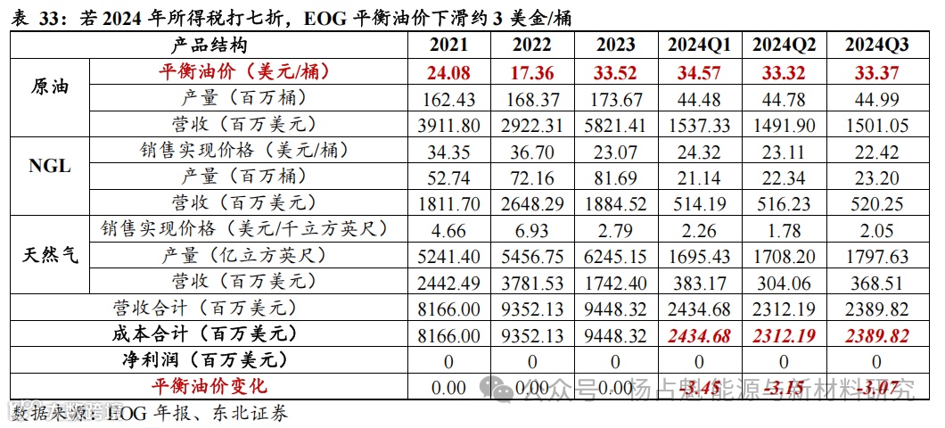 通过敏感性分析,我们发现:若2024年天然气价格维持在3美金/Mcf,EOG平衡油价下滑约4美金/桶;若所得税打七折,EOG平衡油价下调约3美金/桶,变化均不大。
