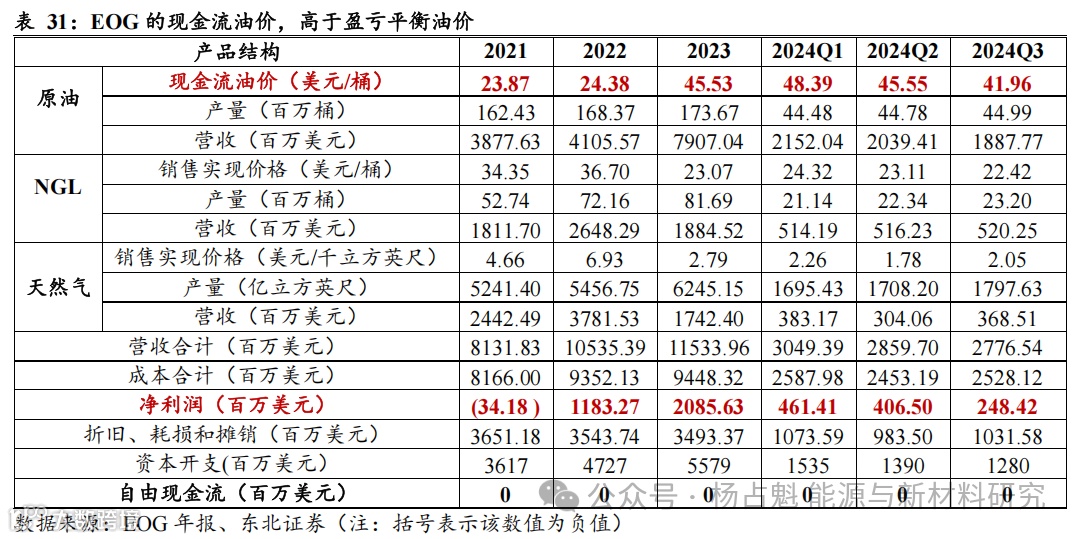 我们根据EOG报表披露的NGL及天然气的产量、均价,原油的产量,油气板块的折旧、耗损和摊销,以及资本开支,可以计算出:2024年,EOG保平自由现金流所需要的最低油价高于平衡油价。这主要是由于EOG自2022年以来资本开支高于折旧、耗损和摊销,因此保平现金流的压力比保平净利润要大,故保平自由现金流所需要的最低油价高于平衡油价。