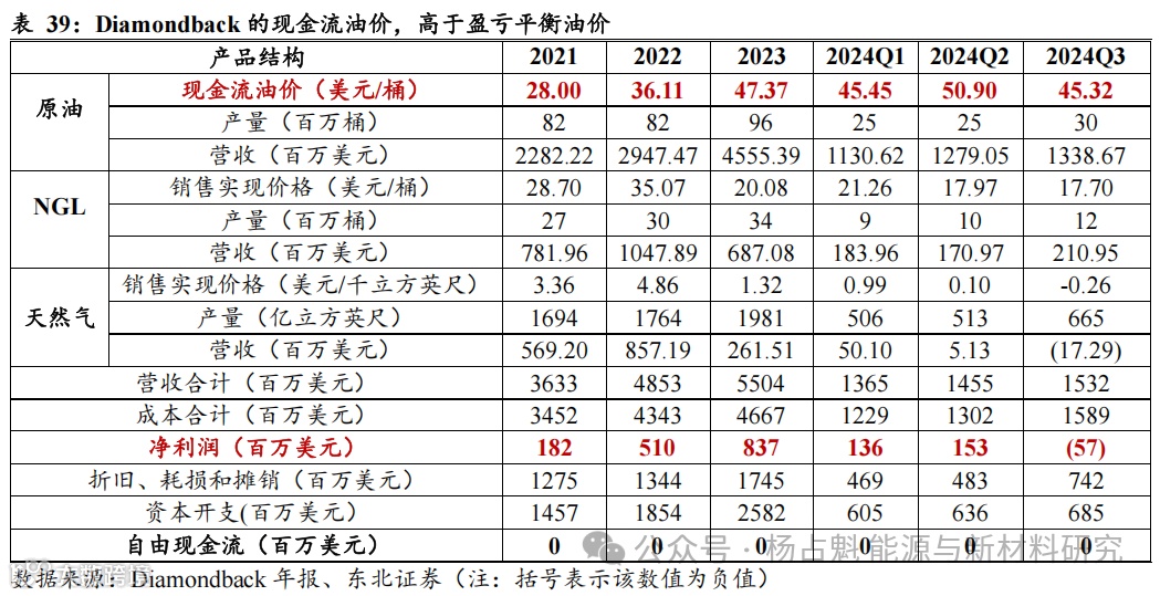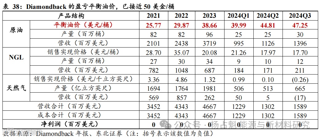 2024年,Diamondback的桶油成本接近30美金/桶,考虑Diamondback天然气售价的持续下滑,2024年Diamondback保平其净利润所需的平衡油价接近50美金/桶。
