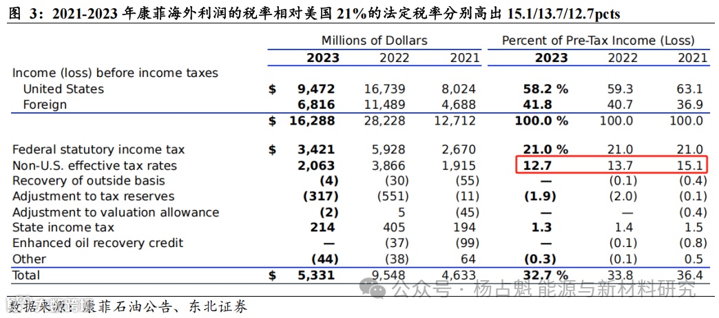 据康菲石油2023年年报,2023年康菲石油的有效税率为32.7%,高于美国法定税率 21%。主要是康菲石油海外收入占比超40%,而海外利润需要按照更高的美国法定税率缴纳税款。根据康菲2021-2023年年报数据,海外利润的税率相对美国21%的法定税率分别高出15.1/13.7/12.7pcts。