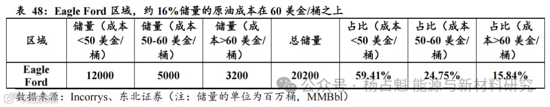 据此我们推算:在Eagle Ford区域,约59%储量的原油成本低于50美金/桶,约25%储量的原油成本在50-60美金/桶,约16%储量的原油成本高于60美金/桶。