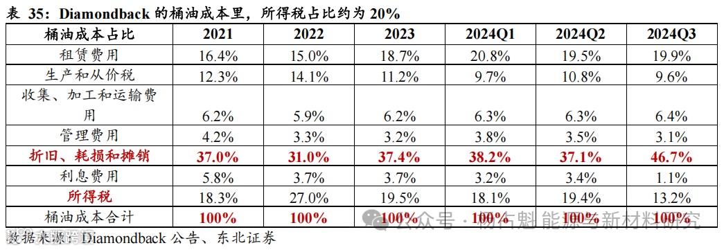 我们发现:Diamondback的含税桶油成本接近30美金。其中,折旧、耗损和摊销占比在40%左右,所得税占比在20%左右,剩下约40%为油气田的管理费用、利息费用和运营费用,以及其他税款。