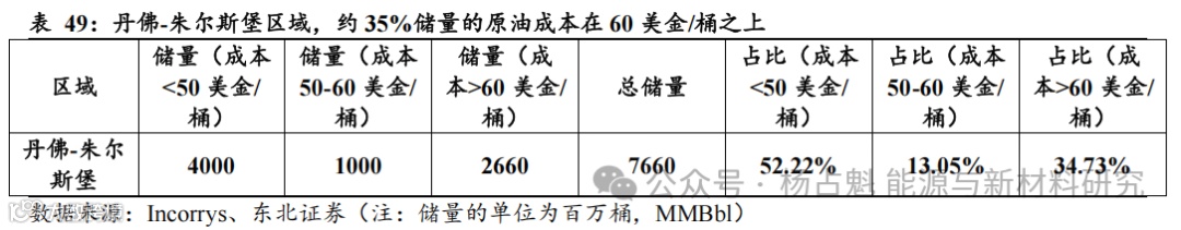 据此我们推算:在丹佛-朱尔斯堡区域,约52%储量的原油成本低于50美金/桶,约13%储量的原油成本在50-60美金/桶,约35%储量的原油成本高于60美金/桶。