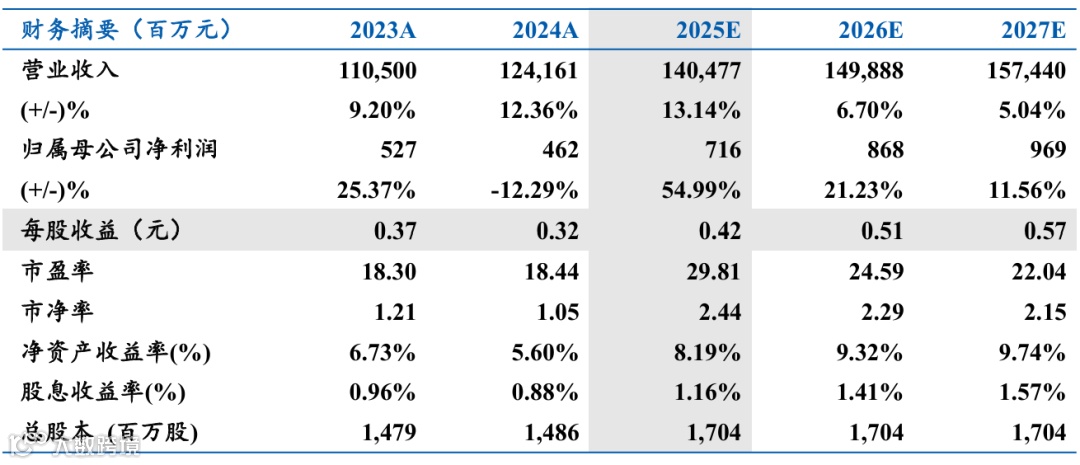 考虑到公司是中国铜加工行业龙头,高毛利产品占比提升,同时布局算力和机器人等高端领域,我们预计2025-2027年公司实现归母净利润7.16/8.68/9.69亿元,对应PE为29.81X/24.59X/22.04X,维持“买入”评级。
