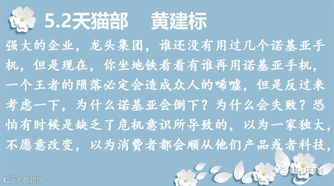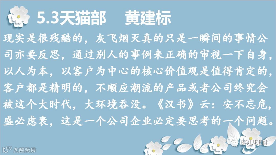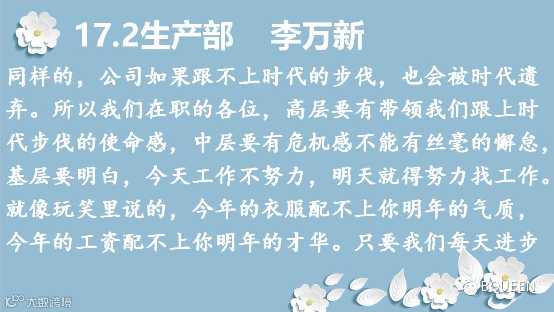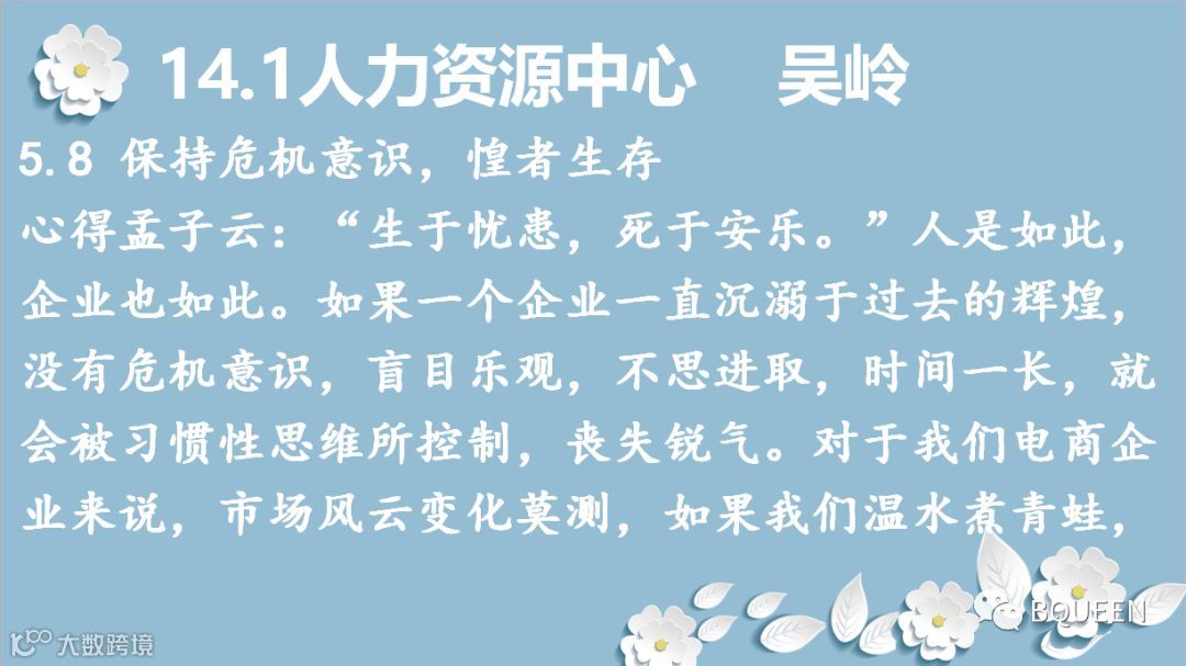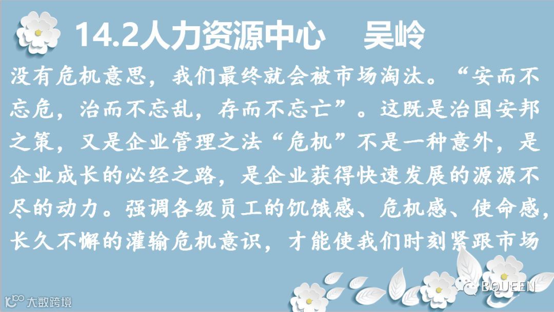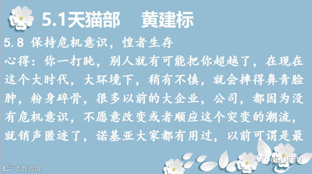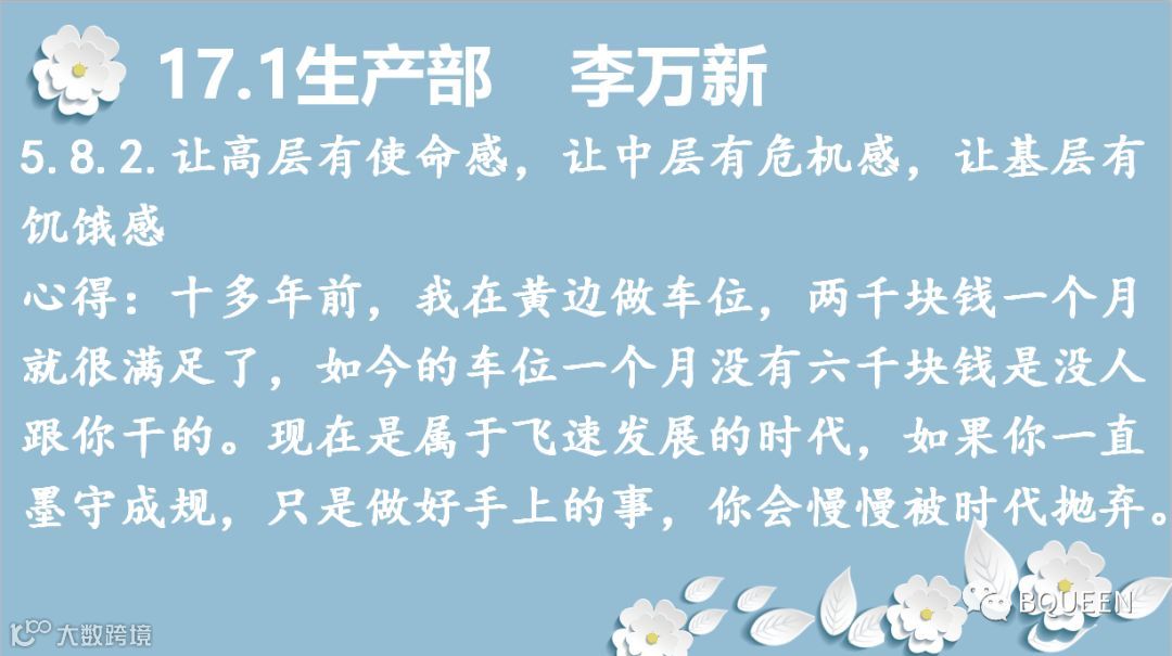 感谢颖舒的总结,保持危机意识,除了我们勇于敢于创新,开拓新产品,发展新战线,更重要地是要稳住我们的根基,守住我们的优势,占领着我们市场屹立不倒,铭记初心,时刻保持使命感和责任感。