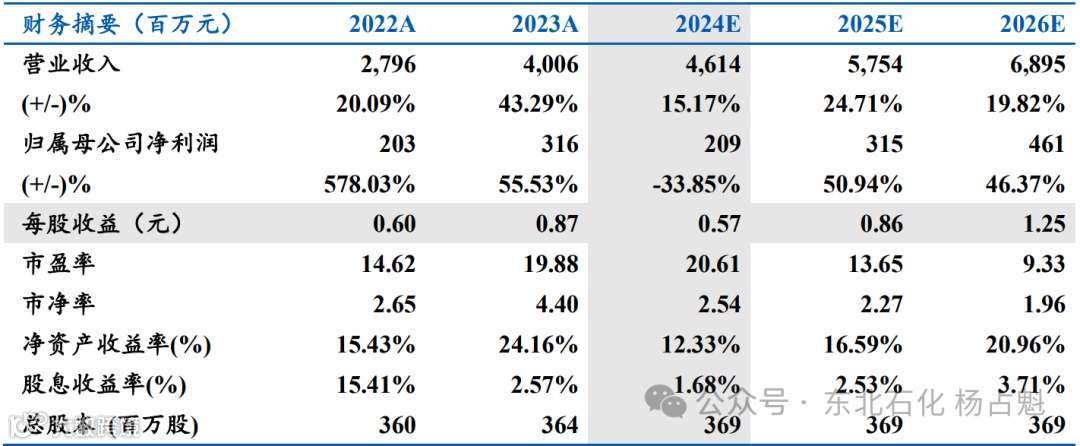 我们预计公司2024-2026年实现营业收入46.14/57.54/68.95亿元,同比+15.17%/+24.71%/+19.82%,实现归母净利润2.09/3.15/4.61亿元,同比-33.85%/+50.94%/+46.37%,对应PE为20.61X/13.65X/9.33X,首次覆盖,予以“买入”评级。
