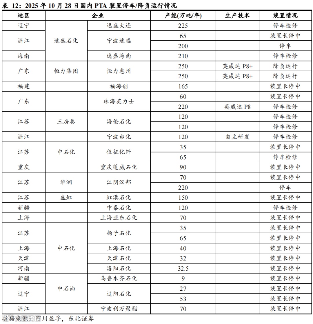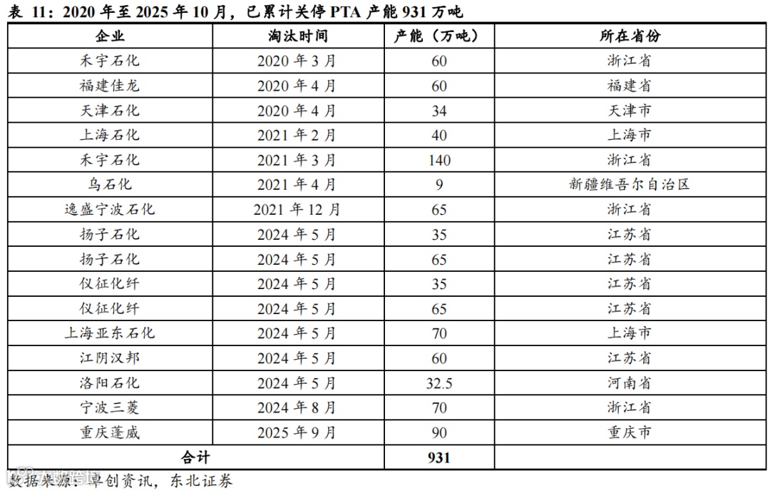 技术迭代带动成本持续优化,小规模老旧装置利润承压。随着科技进步,PTA行业正朝着技术密集型和产业升级型方向发展,新装置的成本优势正逐步倒逼高成本老旧装置出清,促进了行业内的优胜劣汰。此外随着产能的集中,预计行业将出现更明显的规模经济效应,这将有助于降低生产成本,提高整体行业效率。据卓创资讯,2020年以来产能规模150万吨以下的老旧装置已陆续关停,2024年我国PTA淘汰产能432.5万吨,2020年至2025年10月,已累计关停产能931万吨。