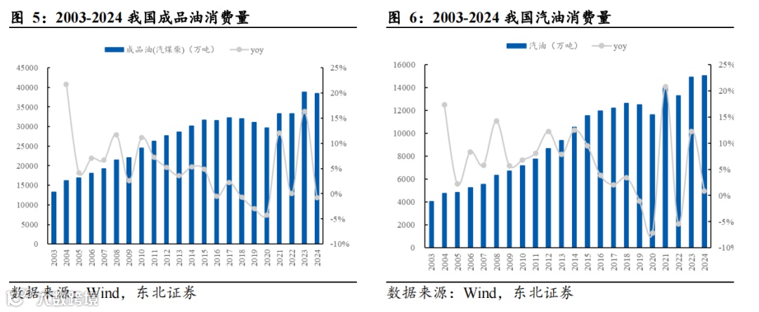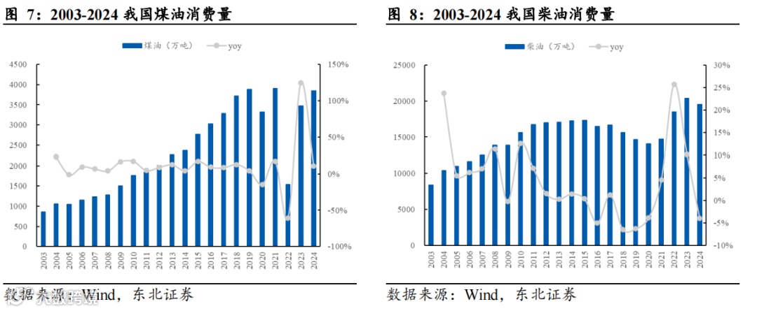 外部环境与行业阶段特征叠加,汽柴油消费拉动力持续转弱。从宏观经济环境看,成品油消费,特别是与宏观经济密切相关的生产性用油变化,取决于宏观经济与行业的增长趋势。2025年,我国经济仍处于调整期,整体来看增速放缓的大趋势并未改变。特别是在房地产、传统基建、建筑施工、采矿、大宗生产加工等“旧动能”领域,产能过剩矛盾凸显,政策传导仍待观察,2024年产业景气程度处于近5年低位(2022年特殊情况除外),产业同比增速出现不同程度回落,难以形成有效增量,带动相关的运输需求和行业用油随之萎缩。