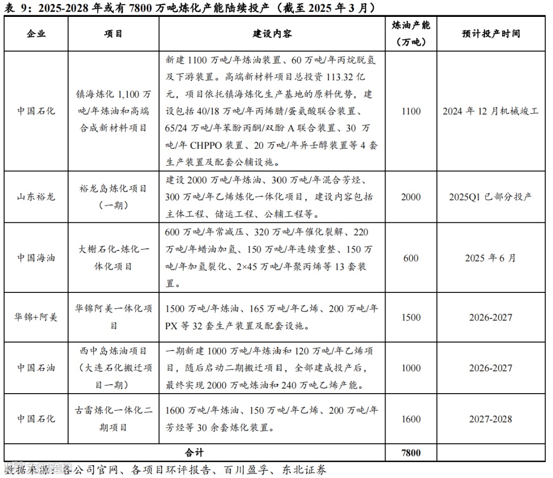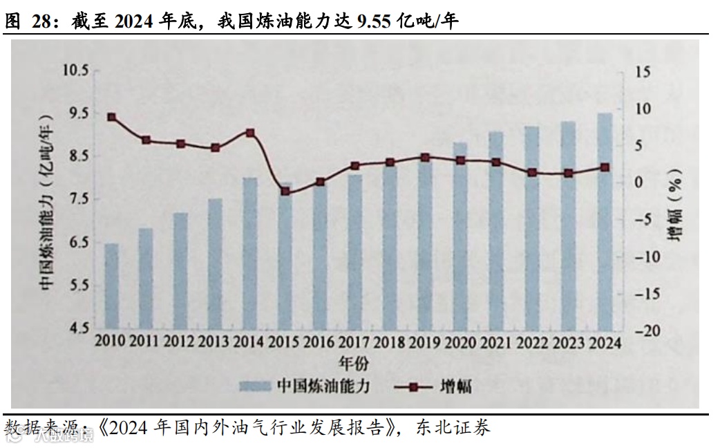 未来炼油能力仍将有一定增长,预计将在2028年左右达峰。据中石油经研院,2025年,国内预计炼油总能力达9.51亿吨/年,减少炼油能力400万吨/年。其中,新增能力600万吨/年,主要来自大榭石化;大连石化继续进行搬迁改造,剩余1000万吨/年炼油装置暂时退出。“十五五”前期,国内炼油能力仍有一定增长,广西石化、吉林石化、齐鲁石化等多个转型升级项目及大连石化、富海石化等产能置换项目将陆续建成投产,预计炼油能力将在2028年左右达峰,峰值为9.8亿吨/年;之后部分落后产能继续退出,预计到“十五五”末,国内炼油能力将降至9.6亿吨/年左右。