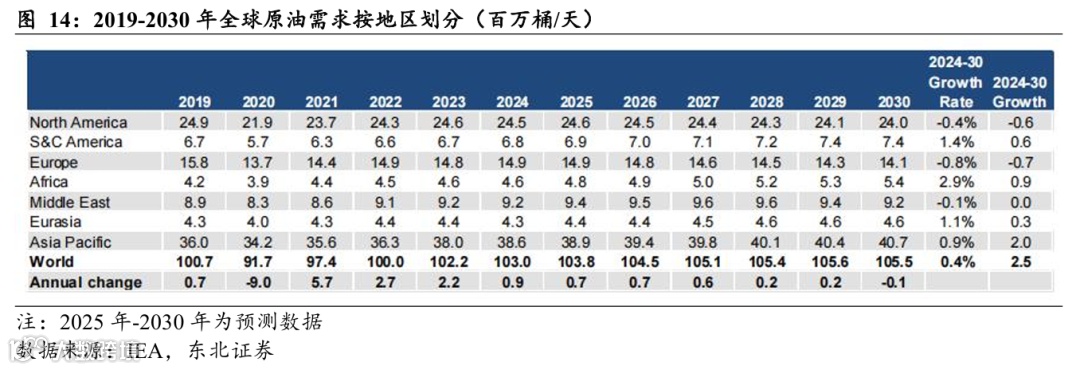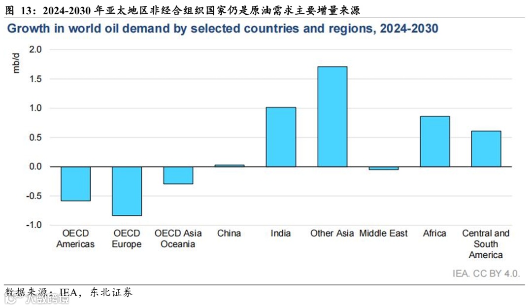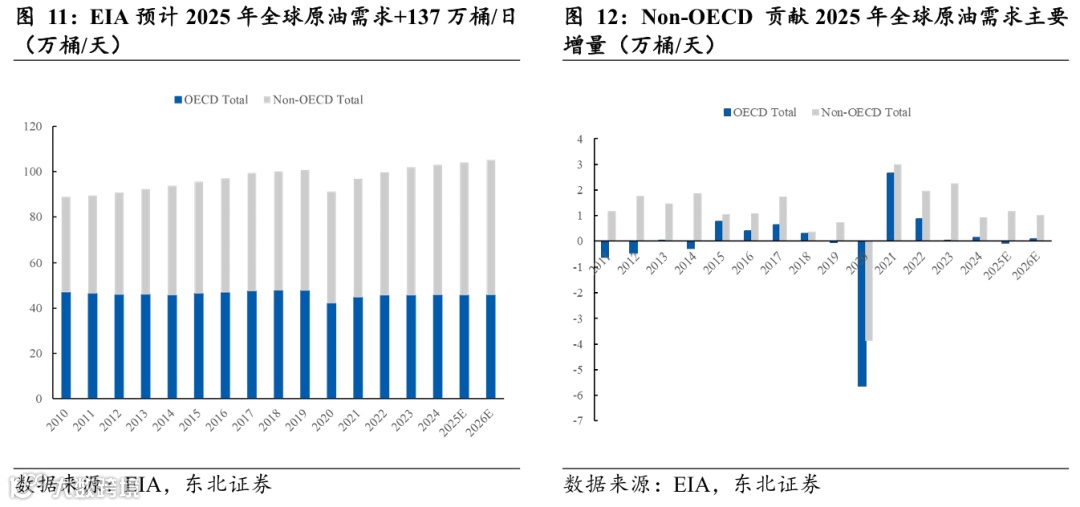 Non-OECD 贡献主要原油需求增量,OECD存量需求保持平稳。据EIA 2025年10月报数据,2024年全球需求量为10291万桶/天,预计2025年全球原油需求量为10399万桶/日,较2024年原油需求+108万桶/日。预计2026年全球原油需求量为10511万桶/日,较2024年原油需求+112万桶/日。