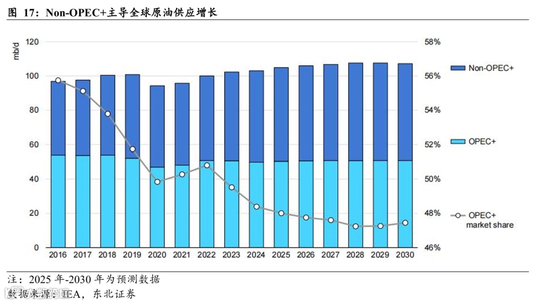 据IEA2025年10月报数据,预计2025年全球原油供给增量为300万桶/天,达到1.061亿桶/天,其中,OPEC+增产140万桶/天,Non-OPEC+增产160万桶/天。展望后续,Non-OPEC+主导全球原油供应增长,OPEC+市场份额或逐步下滑。