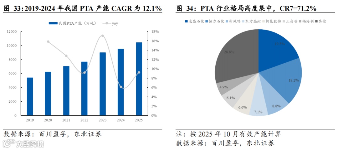 国内PTA产能快速扩张。“十四五”期间,国内PTA产能快速扩张,行业整体过剩压力较大。据百川盈孚数据,截至2025年9月,我国PTA产能为10403.5万吨(有效产能为9135.0万吨),同比+9.24%。2019-2024年我国PTA产能CAGR为12.1%,整体增速快于需求增速。