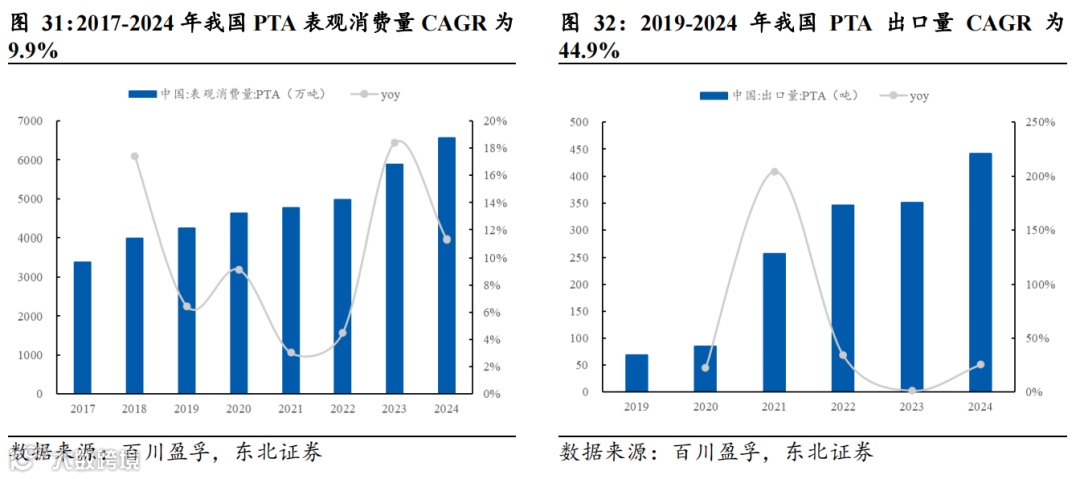 国内PTA表观消费量稳步增长,据百川盈孚数据,2024年我国PTA表观消费量为6557.62万吨,同比+11.3%,2017-2024年消费量CAGR为9.9%。2025年1-9月我国PTA表观消费量为4989.43万吨,同比+3%。出口方面,据百川盈孚数据,2024年我国PTA出口量为441.81吨,同比+25.9%,2019-2024年出口量CAGR为44.9%。