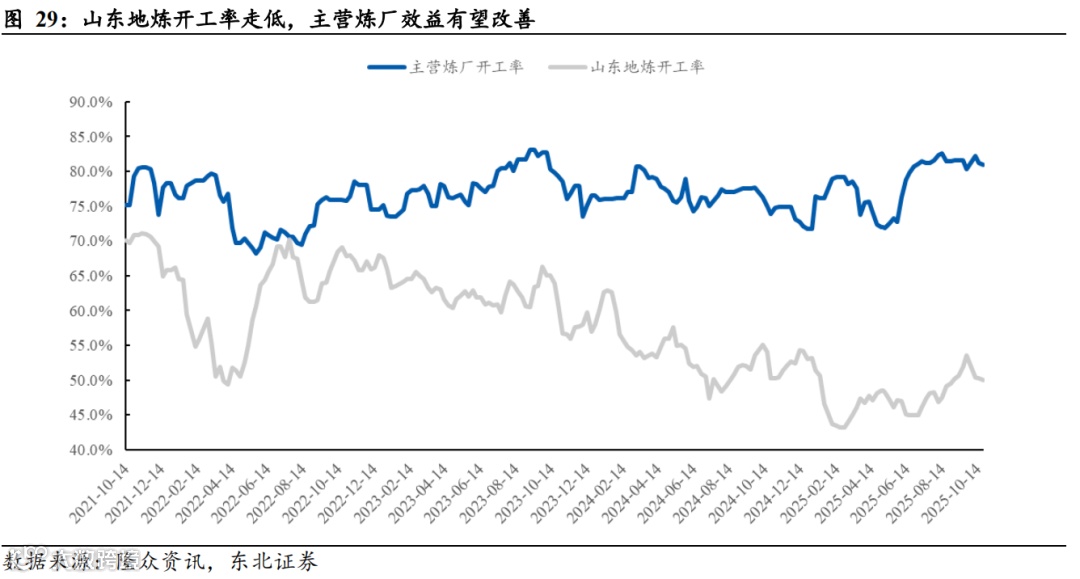 伴随成品油消费税逐步收紧、一系列成品油市场整顿行动的开展,市场逐步向有序化、规范化、公平化转变,营造良好的营商环境的同时,也倒逼部分不法炼厂退出市场,行业出清有望加速。据百川盈孚数据,2025年上半年,主营炼厂开工率维持在70%-80%,而山东地炼开工率已下滑至50%以下。