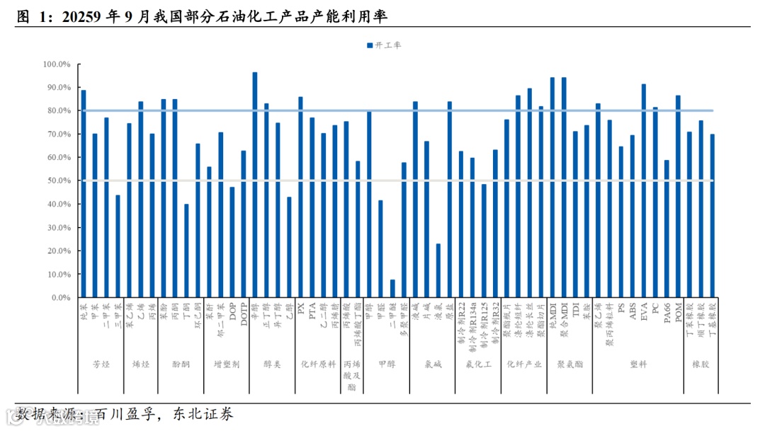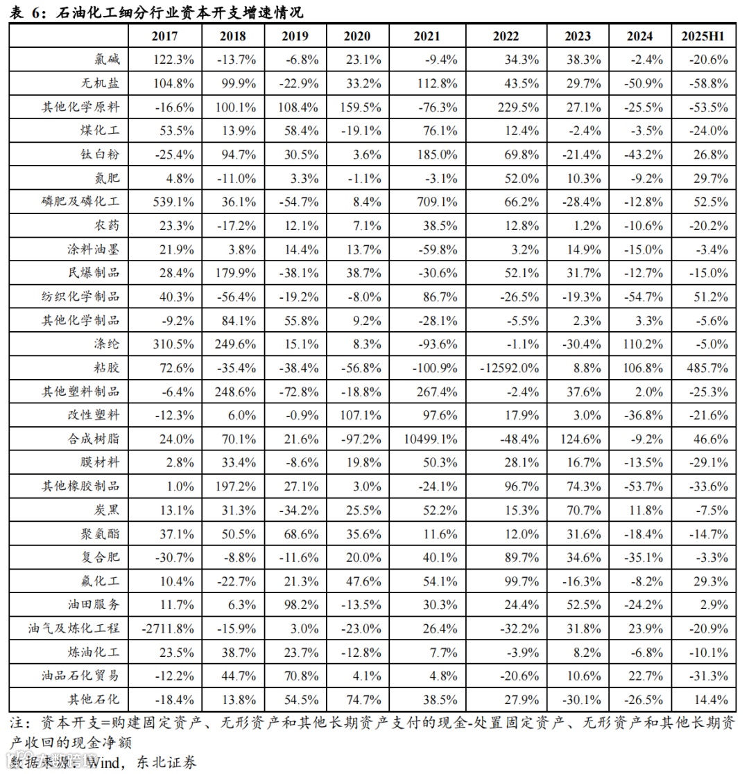 从细分行业看, 2025年上半年仅氟化工、磷肥及磷化工、氮肥、钛白粉、粘胶等少数领域维持较高景气,多数子行业的资本开支增速已转为负值。随着上游资本开支整体放缓,后续在建工程增速预计也将逐步回落。然而,当前行业固定资产规模仍处高位,既有产能与在建产能仍需时间消化。未来,若“反内卷”类产业政策得以明确推进,落后产能有望加速出清,从而推动行业供需结构改善,带动整体景气度回升。