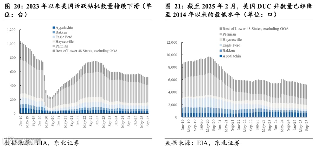 旧井衰竭压力加重+活跃钻机数和DUC井数明显下滑,大幅扩产能力或存疑。由于页岩油高衰减的特性,美国原油增产依赖钻井的持续投入,需要不断钻探新井来补充老井的产量损失。而2023年以来,美国石油活跃钻机数和DUC井数明显下滑,页岩油旧井衰竭压力加重。从钻机数来看,据EIA数据,美国活跃钻机数由2023年初的748台下降约24%至2025年9月的524台。从DUC井数量来看,据EIA数据,截至2025年9月,美国DUC井数量已经降至5192口,为2014年以来的最低水平。