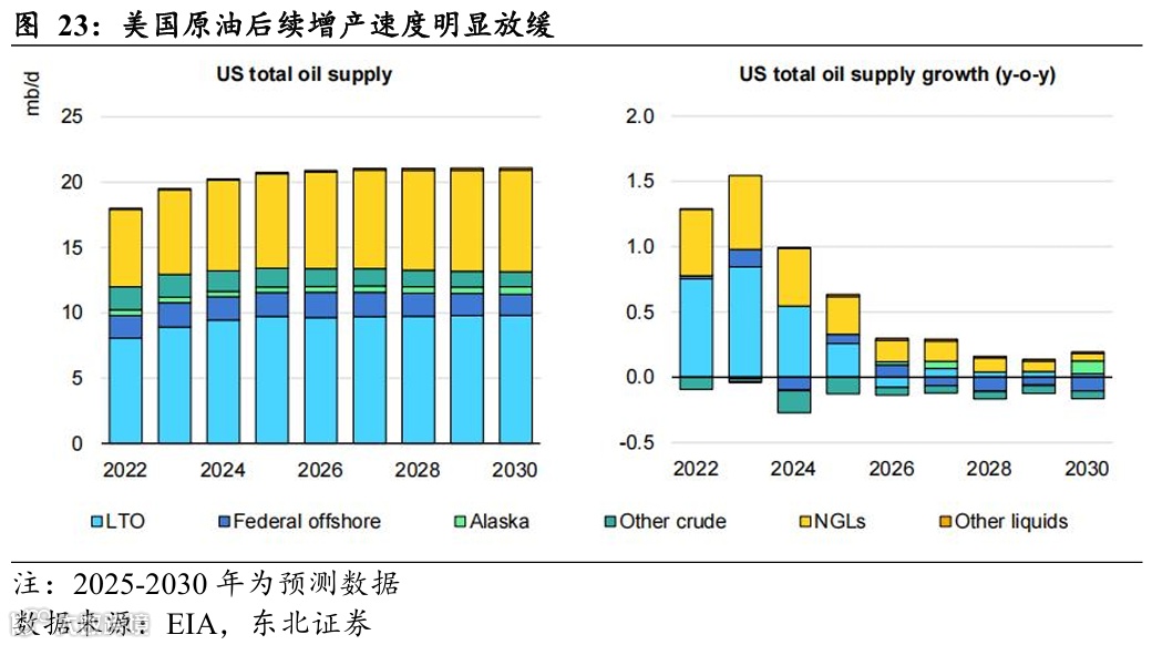 综上,我们认为,美国页岩油当前面临旧井衰竭压力加大以及运营开采成本提升的双重压力,叠加油企高股东回报、降低杠杆、清洁能源投资的行为模式持续,上游资本开支意愿相对较弱。同时钻机数与DUC井数量已下滑至历史低位,美国原油大幅增产能力存疑。页岩油的产量或正在接近拐点,后续增产潜力或面临瓶颈。据EIA数据,2024年美国页岩油产量为885万桶/天,同比+30万桶/天,2023年同期为+72万桶/天。
