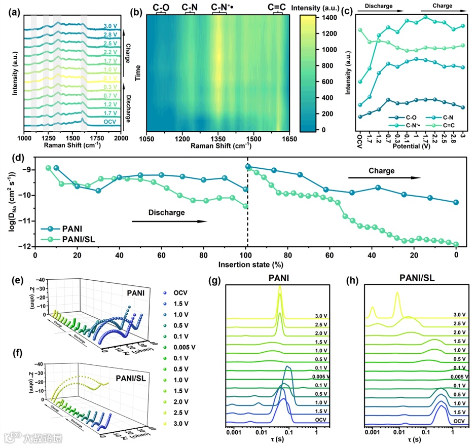 原位拉曼光谱显示放电过程中,C–O、C–N、C–N+・及C=C峰强度增强,充电后减弱。GITT计算钠离子扩散系数表明,PANI/SL在高电压脱钠过程中动力学过程缓慢,源于氧的电负性高于氮,脱钠过程需克服更高能垒。原位EIS显示PANI/SL因形成连续的导电网络,初始阻抗更低,电荷转移动力学更优异。DRT图显示PANI/SL电极在2~3 V范围内,出现另一弛豫峰与木质素中含氧官能团的法拉第氧化还原反应相关,可加速钠离子传输。
