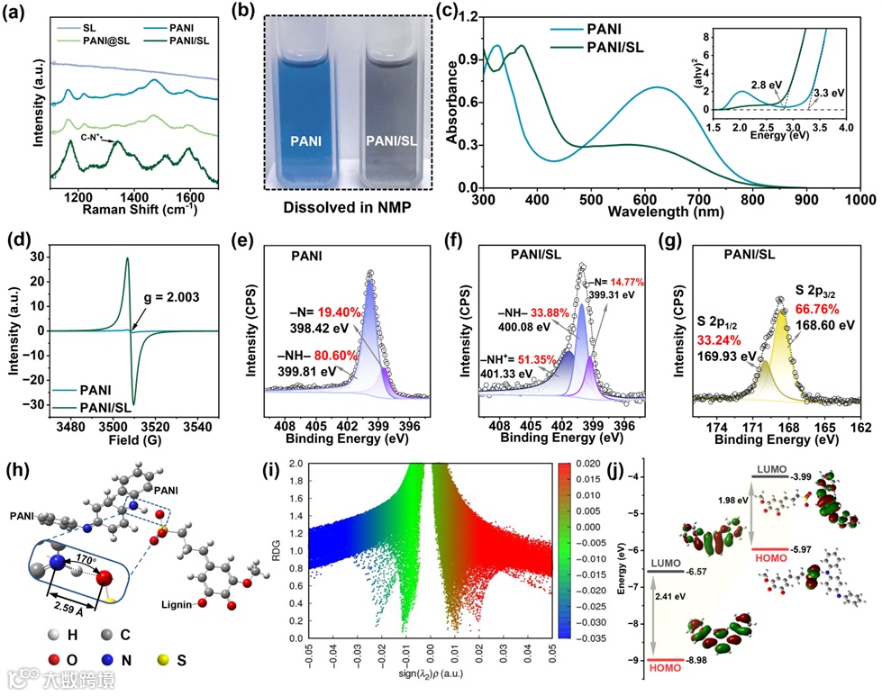 作者采用多种表征方式验证复合材料中的非共价相互作用。拉曼光谱证实PANI亚胺基团的质子化;UV-Vis中,PANI/SL与PANI中醌-苯跃迁相关的630 nm处吸收峰显著减弱,表明SL降低了PANI中极化子跃迁所需的能量;Tauc图显示SL掺杂引起的带隙窄化;EPR为极化子转变提供证据;XPS的N 1s光谱显示PANI/SL中存在–NH+=,S 2p光谱证实–SO3-的存在;几何优化表明质子化亚胺氮与磺酸盐氧之间存在强氢键;RDG分析验证清晰识别出强氢键和π-π堆积区域;电子结构计算显示 PANI/SL的HOMO-LUMO能隙降低。