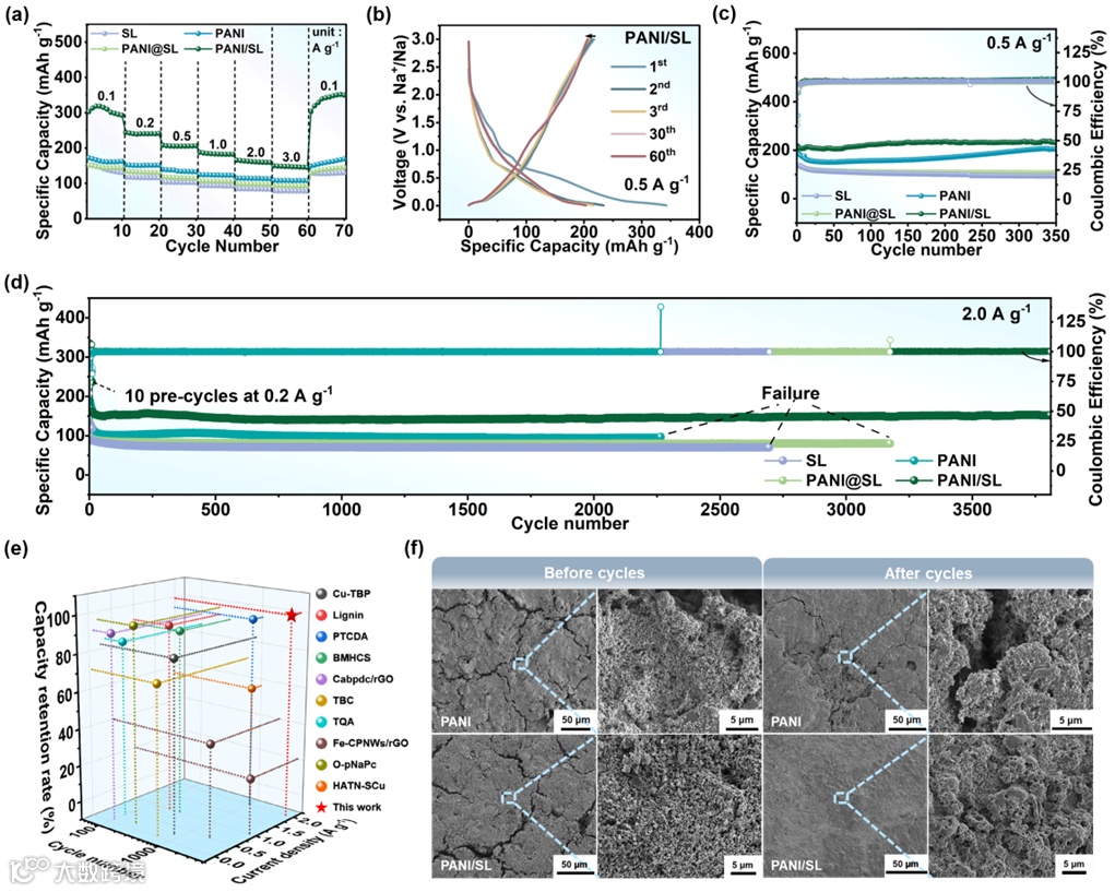 半电池电化学性能测试表明,PANI/SL在0.1、0.2、0.5、1.0、2.0和3.0 A g-1下,容量分别达到302.9、244.5、208.0、187.9、165.6和149.5 mAh g-1。0.5 A g-1下PANI/SL循环350圈后仍保持239.8 mAh g-1的容量,PANI/SL的容量保持率达到98.1%。2.0 A g-1 PANI/SL可稳定循环3800圈,最终容量为151.8 mAh g-1,容量保持率高达99.2%。对比已报道有机负极(包括有机-无机复合负极),PANI/SL表现出极具竞争力的循环寿命。通过SEM分析微观结构演变,进一步证实了电极完整性的宏观差异。