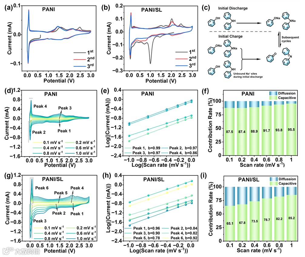 PANI/SL在0.1 mV s-1扫速下的首圈循环伏安曲线中,氧化峰在首圈与后续循环中重叠性较差,而还原峰重叠度良好,与初始电化学活化过程一致。PANI和PANI/SL电极的主要氧化还原峰对应的b值均接近1.0,表明两者均以表面电容型存储为主。PANI/SL电极可通过扩散控制过程获得额外储钠容量,与官能团氧化还原反应实现协同储钠。