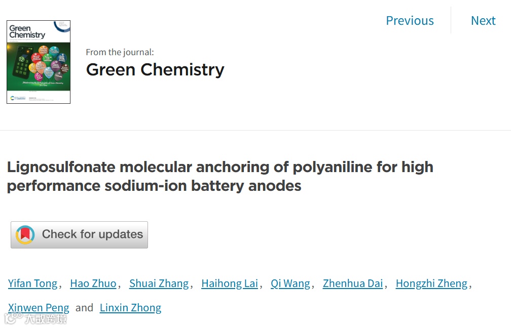 近日,华南理工大学先进造纸与纸基材料全国重点实验室联合新加坡国立大学机械工程系在国际顶级期刊Green Chemistry (影响因子:9.2) 上发表题为“Lignosulfonate molecular anchoring of polyaniline for high performance sodium-ion battery anodes”的研究工作。本研究提出一种简易绿色的分子锚定策略,构筑聚苯胺/木质素磺酸盐PANI/SL复合负极。其中木质素磺酸盐既可作为生物质基模板,又可充当掺杂剂,构建耐溶解、非共价一体化的导电网络。电化学测试结果表明:该PANI/SL负极展现出优异的循环稳定性,在2.0 A g-1电流密度下循环3800圈后,容量保持率仍可达99.2%。机理研究证实,材料储钠行为来源于C=N、C=O官能团的氧化还原反应,以及π-Na+的相互协同作用。此外,放大制备实验进一步验证了该分子锚定结构的稳定性与实用性。