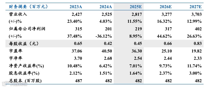 考虑到市场环境仍处于阶段性承压状态,我们调整公司盈利预测,预计2025-2027年公司实现归母净利润2.19/3.17/4.02亿元,对应PE为36.30X/25.10X/19.82X,维持“买入”评级。