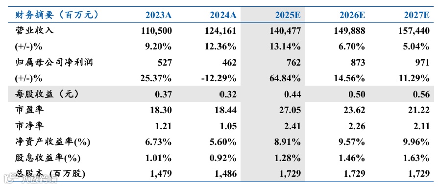 考虑到公司是中国铜加工行业龙头,高毛利产品占比提升,同时布局算力和机器人等高端领域,我们预计2025-2027年公司实现归母净利润7.62/8.73/9.71亿元,对应PE为27.05X/23.62X/21.22X,维持“买入”评级。