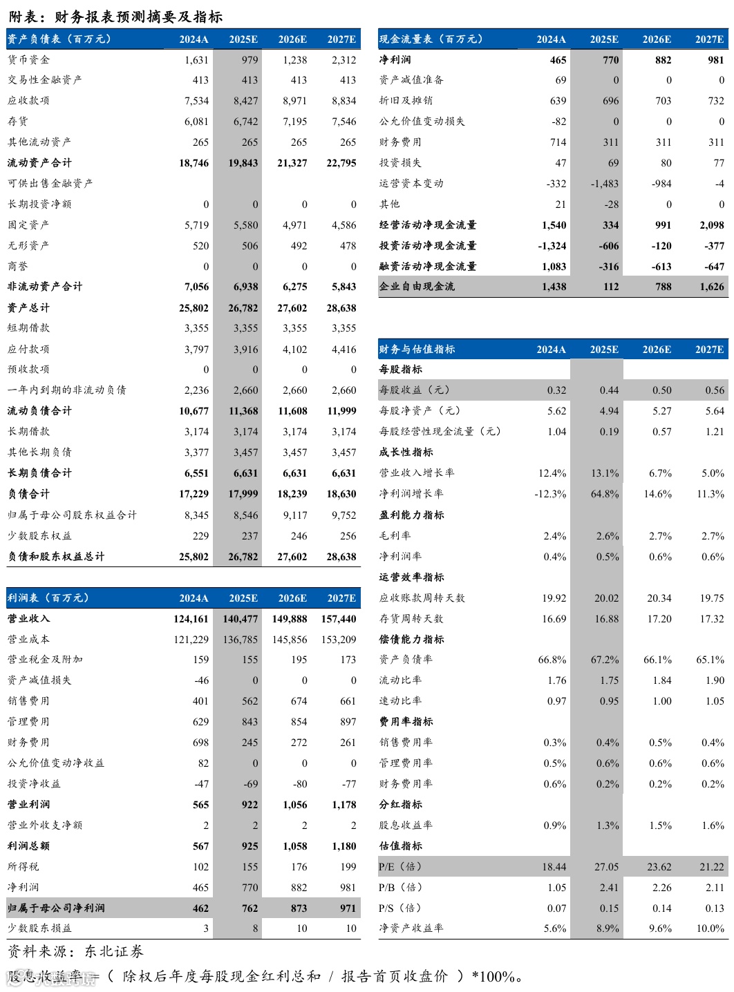 根据公司公告,2025前三季度公司实现营收917.65亿元(同比-0.09%),实现归母净利润5.88亿元(同比+104.37%),实现扣非归母净利润4.00亿元(同比+205.69%);2025年Q3公司实现营收324.71亿元(同比-4.42%),实现归母净利润2.15亿元(同比+30.30%),实现扣非归母净利润1.37亿元(同比+1326.18%)。