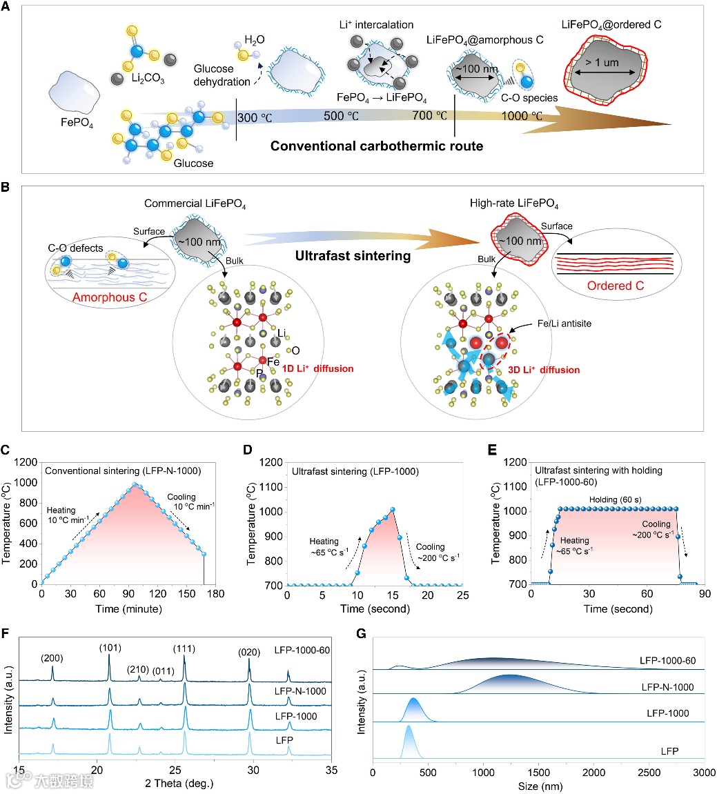 当前,大量商用电池级橄榄石类正极材料在满足下一代快速充电技术的需求方面面临着重大挑战。将这些大量现有材料的丢弃或不加选择地回收将造成严重的资源浪费和环境负担。如何进一步提高商用橄榄石类正极材料的快充能力是当前研究者所深思熟虑的问题。以橄榄石型磷酸铁锂(LiFePO₄,LFP)为例,其电子导电性的核心调控手段之一是优化表面碳层的结晶度。传统碳热合成工艺的烧结温度通常为 600℃–800℃,在此温度下生成的碳层结晶度偏低,多为近无定形结构,电子导电率难以满足快充需求。理论上,提高烧结温度可显著提升碳层结晶度与材料电导率,然而,这引发了另一个问题:从热激活晶体生长的 Arrhenius 动力学方程的角度来理解,在常规烧结模式下,提高烧结温度可能会显著增加晶粒径尺寸,从而对 LFP 的倍率性能产生不利影响。问题显而易见,如果能同时提高LFP碳层表面的结晶度又不影响其原本的纳米颗粒尺寸,那么商业化橄榄石类材料快充性能达到天花板的问题很可能被解决。