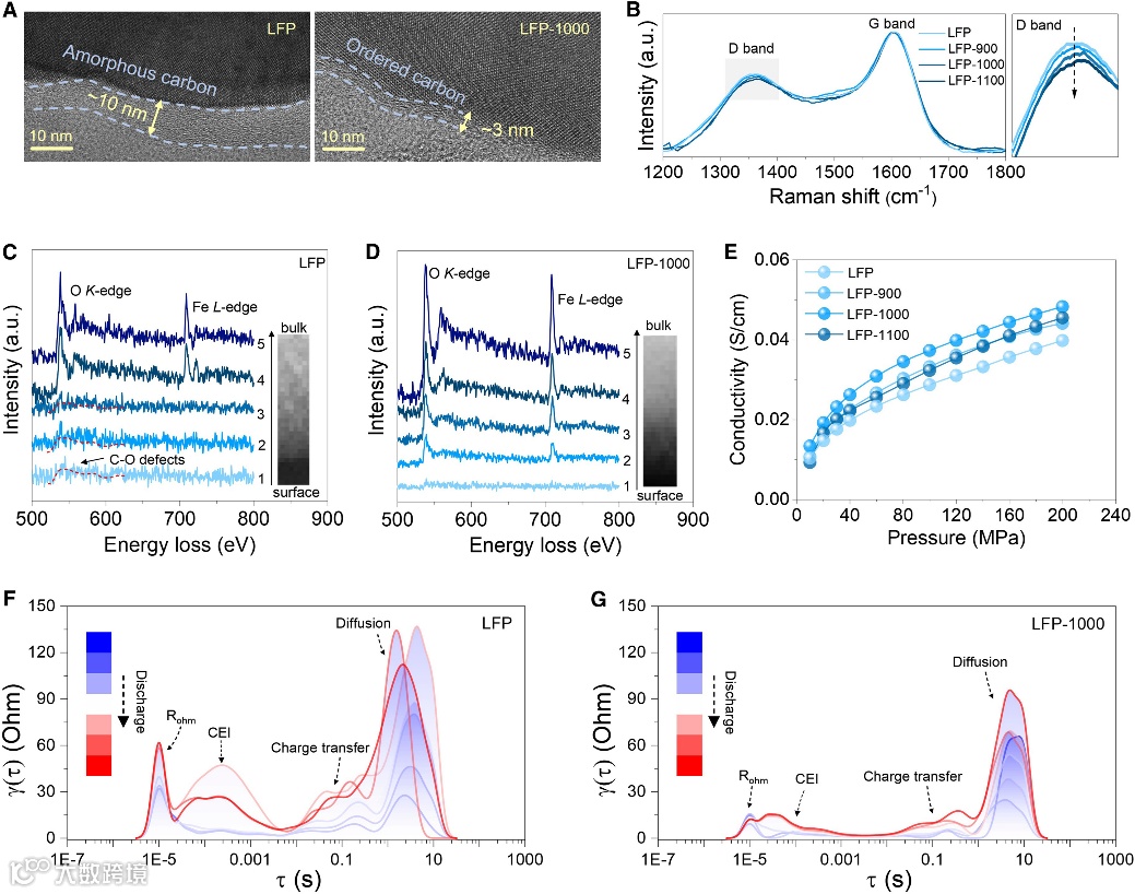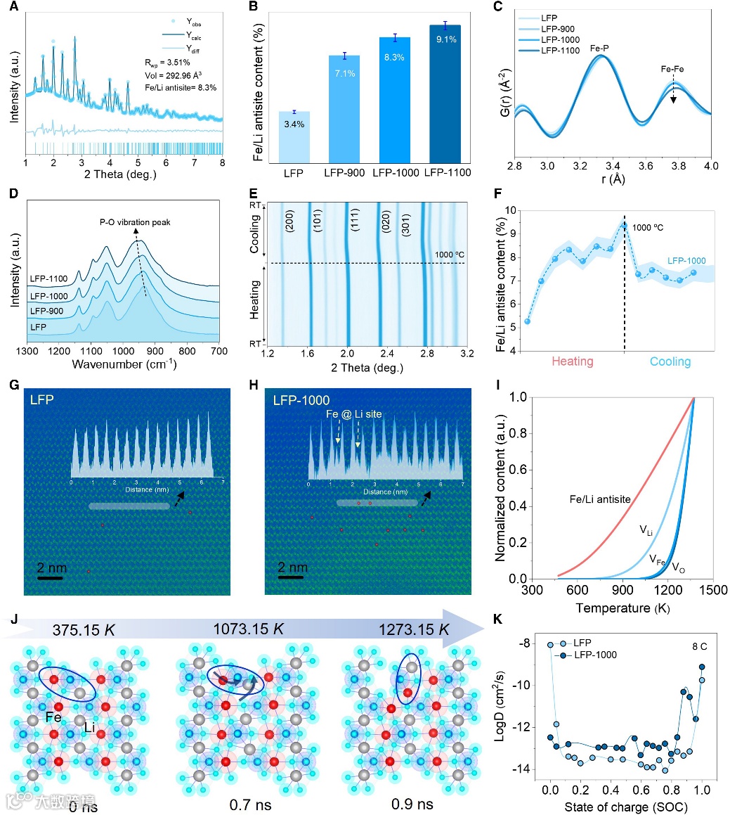 实现电子 - 离子传导双提升,破解 LFP 快充本征瓶颈该工艺通过双维度结构调控,同时攻克了橄榄石正极快充的两大核心限制:表面层面,大幅降低碳层 C-O 缺陷、提升碳层有序度,显著增强材料电子导电性;体相层面,使 Fe/Li 反位缺陷含量翻倍,打破锂离子一维扩散限制、构建三维扩散通道,大幅提升锂离子扩散系数,从材料本征上实现了电子与离子动力学的同步优化。